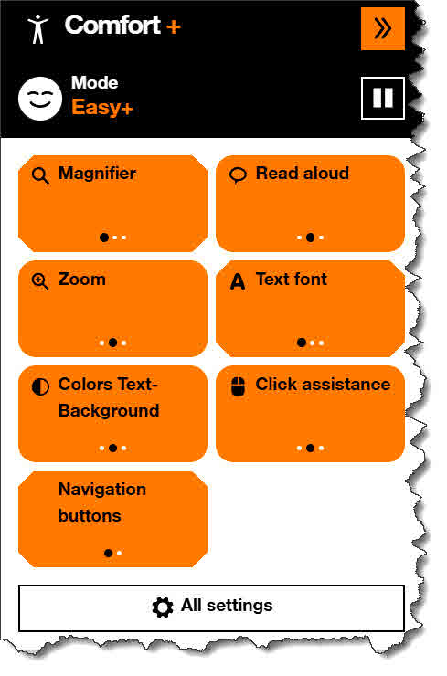 The Comfort+ palette is organized into groups of settings, some designed for users seeking just a bit more ease of use ( Easy+ mode), others for those looking for light visual adjustments ( Visual+ mode) or more advanced visual settings such as high zoom and very high contrast ( Visual++ mode).